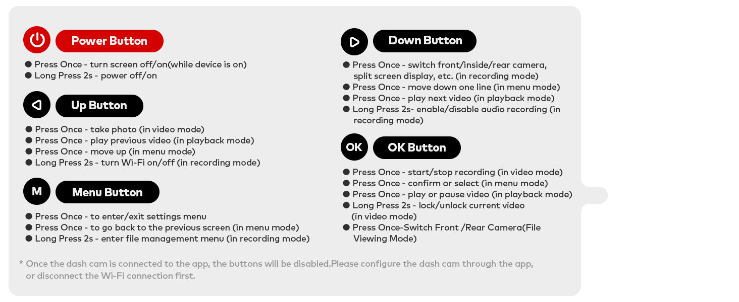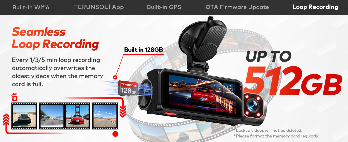 • Loop Recording & Impact Lock: 128GB card included. Loop recording runs continuously, while the G-sensor locks collision footage.
