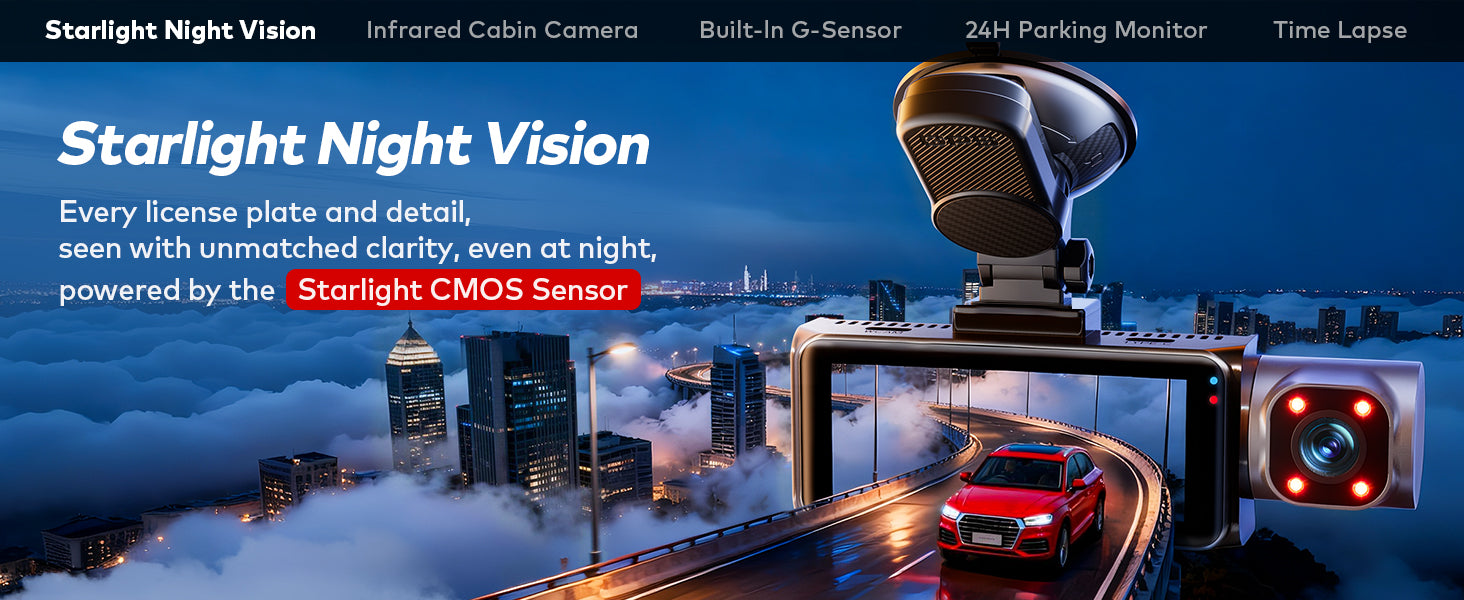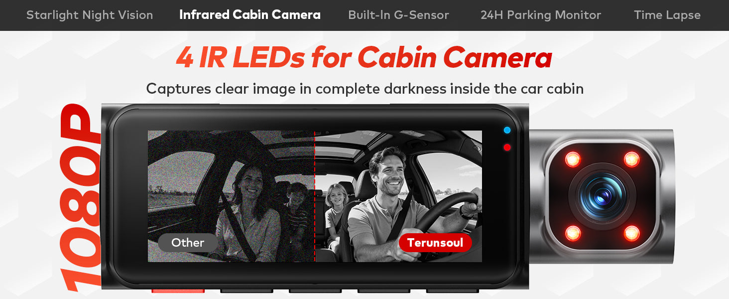 • Night Vision & IR Cabin Camera: Starlight night vision delivers clear low-light footage, with IR LEDs for cabin recording in darkness.