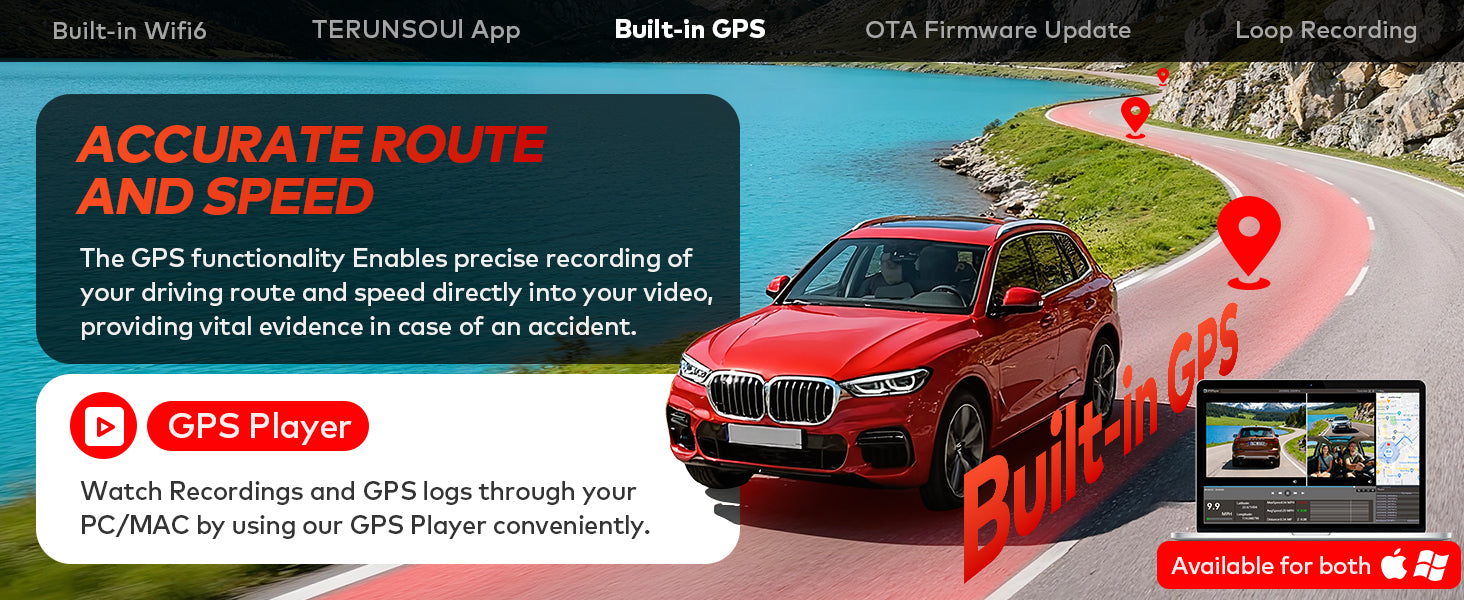 • GPS & Parking Mode Support: Built-in GPS records speed and routes. Supports 24-hour parking monitoring (hardwire kit required).